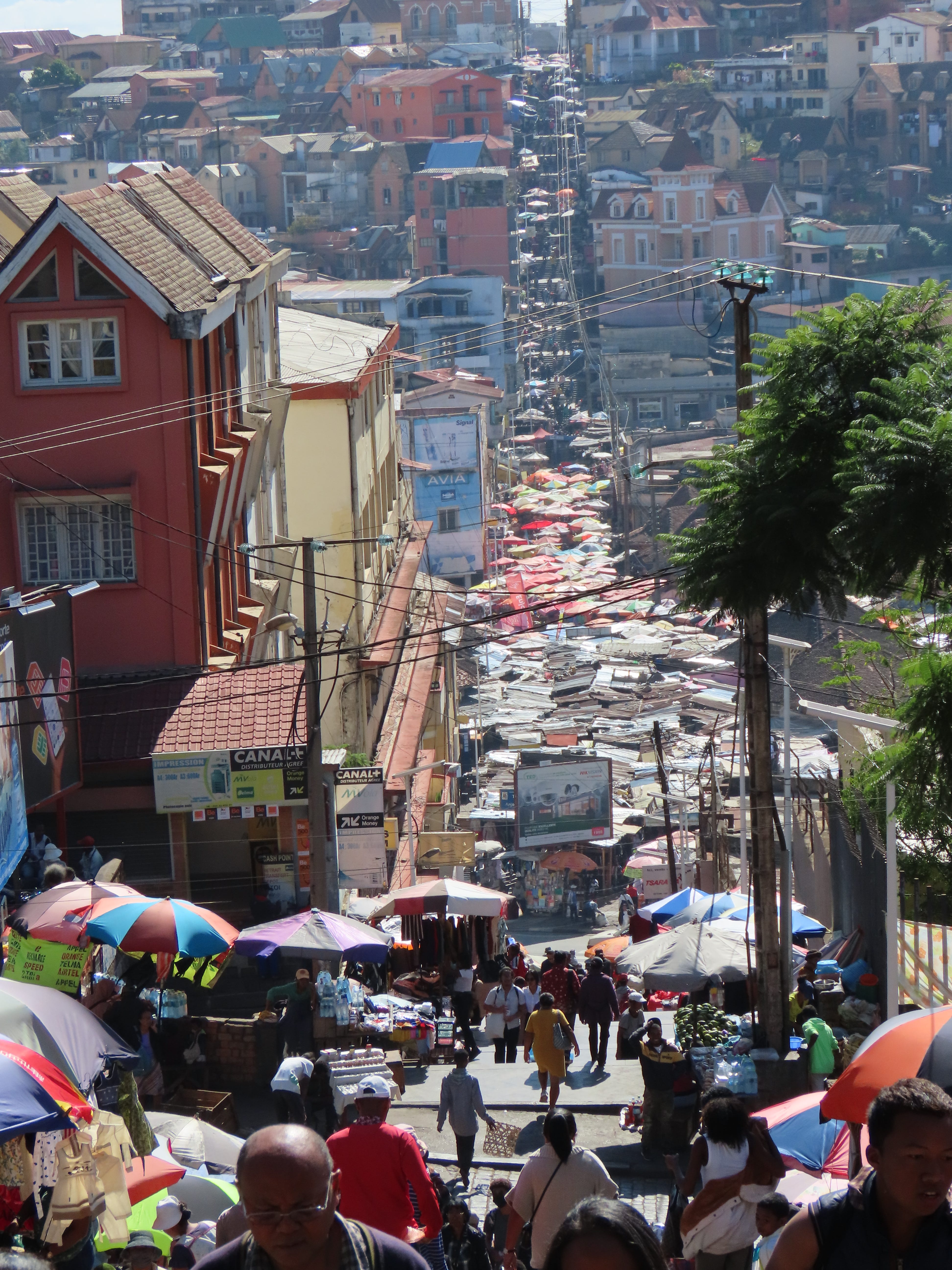 Antananarivo, like San Francisco or Pittsburgh, is a city built on and around hills. This is looking down a 5 or 6 story outdoor staircase from near where we were staying to the Analakely market of stalls covered with umbrellas.