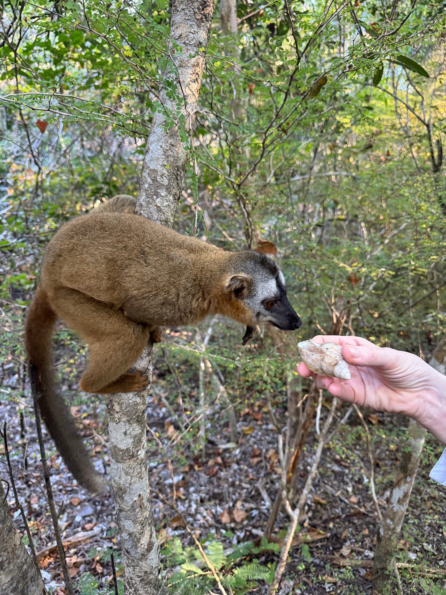 Rules about interaction are a little more lax at the private Kirindy reserve—the local guide encouraged us to offer water in snail shells found on the trail. That’s Julie’s hand in the photo. The lemurs would reach out and pull us closer to get a drink. Their padded fingers were both soft and strong.