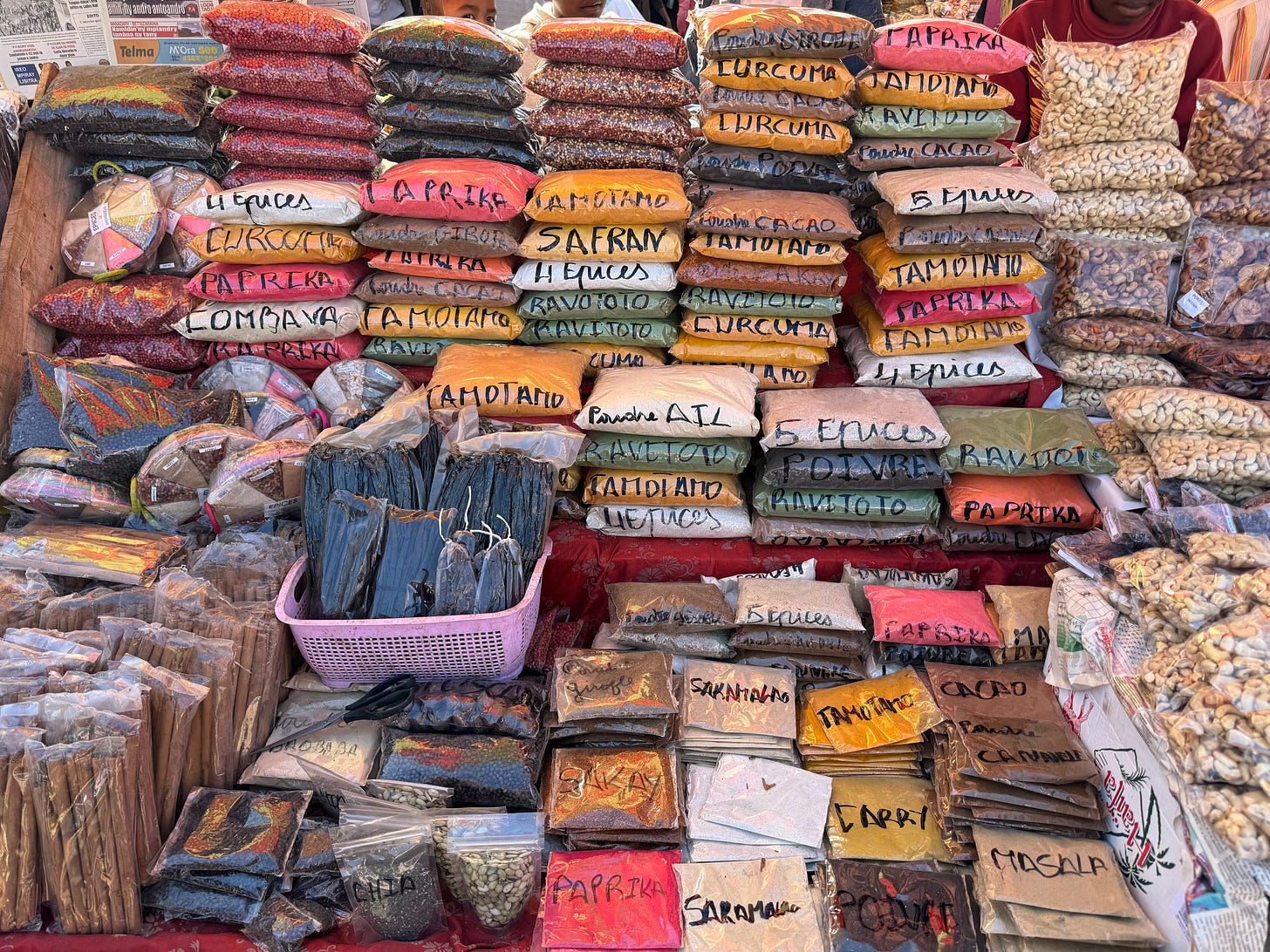 Spice stall in Analakely, with vanilla bean pods in the pink plastic basket. Reminded me of Middle Eastern souks. We limited our photography in Tana as we were warned that there were many pickpockets and people who might snatch our fancy phones.